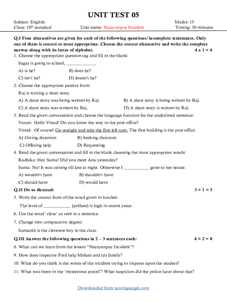 UNIT TEST 05 Subject: English Class: 10th standardUnit name: Narayanpur IncidentMarks: 15 Timing: 30 minutesQ.I Four alternatives are given for each of the following questions/incomplete statements.
