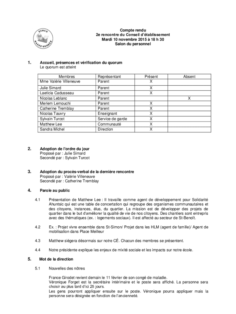 Compte rendu 2e rencontre du Conseil dtablissement Mardi 10 novembre 2015 18 h 30 Salon du personnel1.Accueil, prsences et vrification du quorum Le quorum est atteint Membres Mme Valrie VilleneuveReprsentant