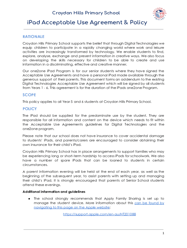 Croydon Hills Primary School iPad Acceptable Use Agreement & Policy