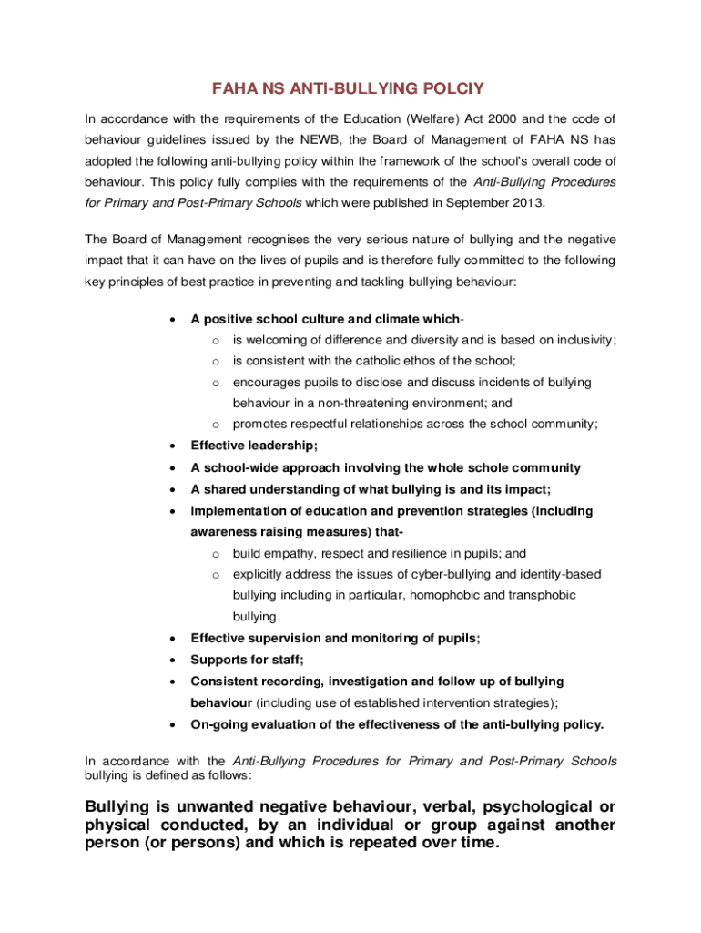 FAHA NS ANTIBULLYING POLCIY In accordance with the requirements of the Education (Welfare) Act 2000 and the code of behaviour guidelines issued by the NEWB, the Board of Management of FAHA NS has