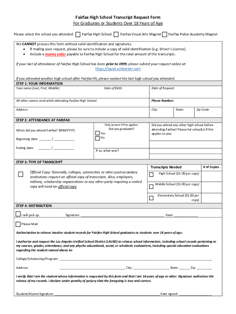 Fairfax High School Transcript Request Form For Graduates or Students Over 18 Years of Age Please select the school you attended:Fairfax High SchoolFairfax Visual Arts MagnetFairfax Police Academy