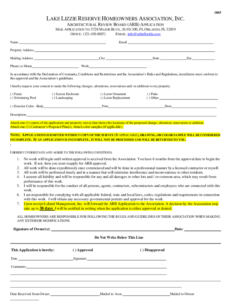 1065LAKE LIZZIE RESERVE HOMEOWNERS ASSOCIATION, INC. ARCHITECTURAL REVIEW BOARD (ARB) APPLICATION MAIL APPLICATION TO: 5728 MAJOR BLVD., SUITE 300, FL ORLANDO, FL 32819 OFFICE: (3214300087) EMAIL: