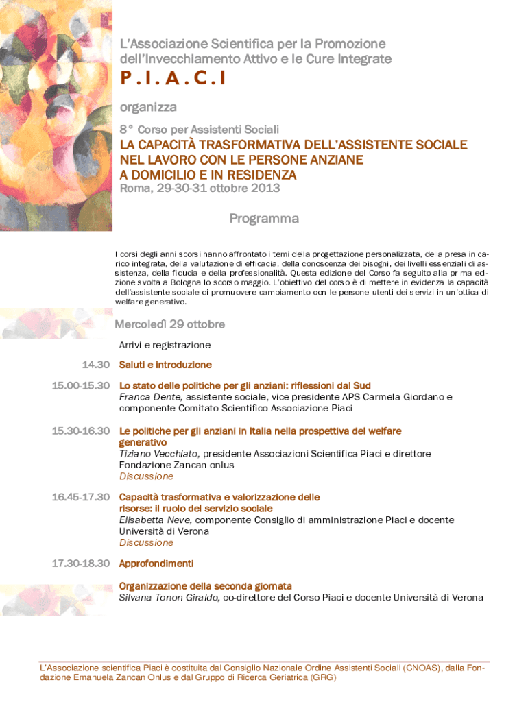 LAssociazione Scientifica per la Promozione dellInvecchiamento Attivo e le Cure IntegrateP.I.A.C.I organizza8 Corso per Assistenti SocialiLA CAPACIT TRASFORMATIVA DELLASSISTENTE SOCIALE NEL LAVORO