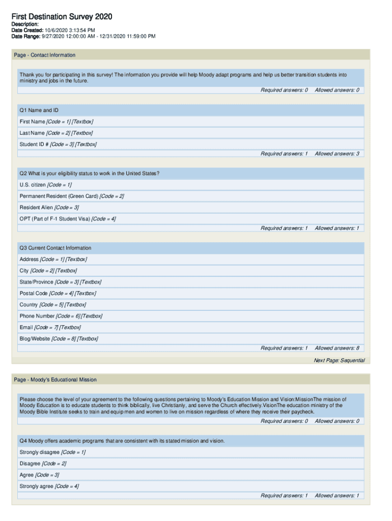 First Destination Survey 2020 Description: Date Created: 10/6/2020 3:13:54 PM Date Range: 9/27/2020 12:00:00 AM 12/31/2020 11:59:00 PMPage Contact InformationThank you for participating in this survey!