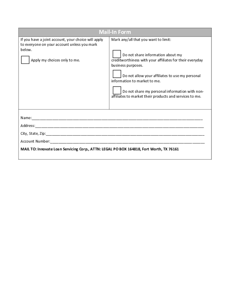 MailIn Form If you have a joint account, your choice will apply to everyone on your account unless you mark below. Apply my choices only to me.Mark any/all that you want to limit:Do not share information