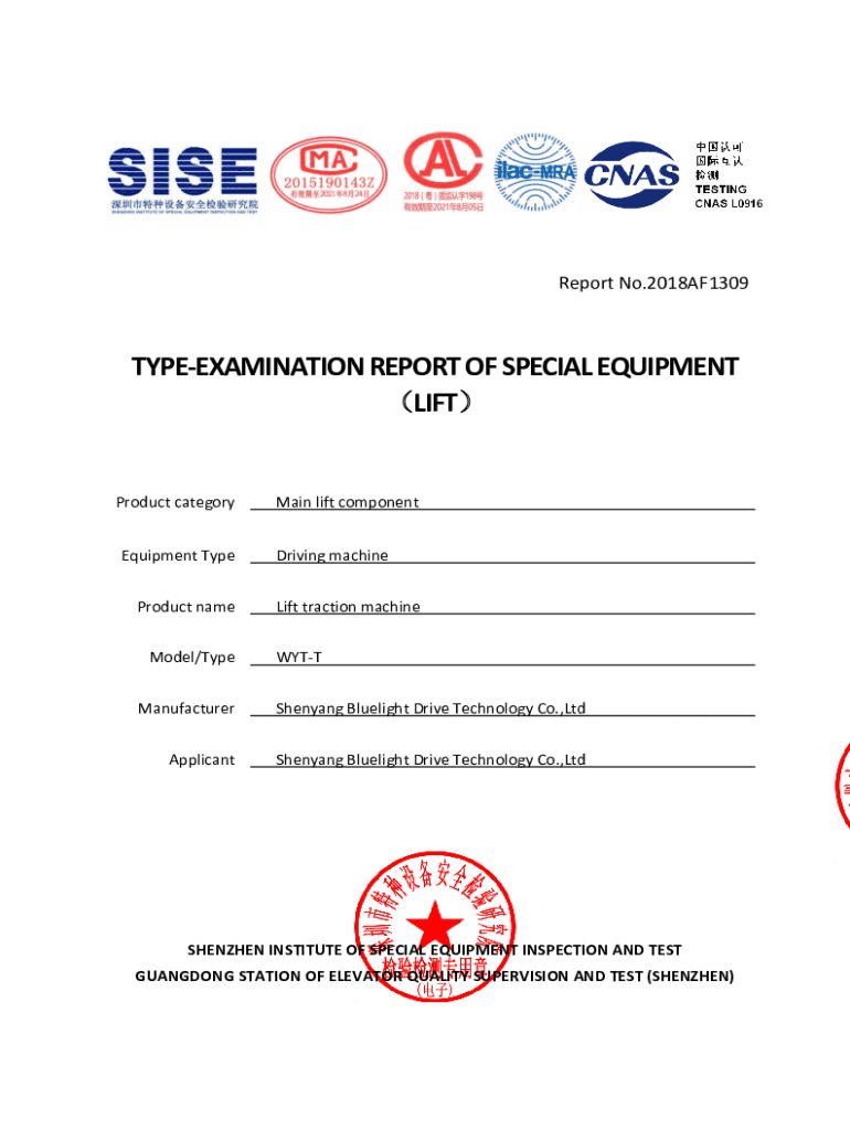 Report No.2018AF1309TYPEEXAMINATION REPORT OF SPECIAL EQUIPMENT LIFTProduct category Equipment Type Product name Model/TypeMain lift component Driving machine Lift traction machine WYTTManufacturerShenyang