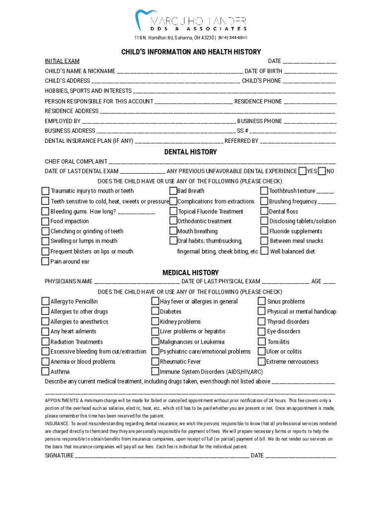 118 N. Hamilton Rd, Gahanna, OH 43230 | (614) 4718055INITIAL EXAMCHILDS INFORMATION AND HEALTH HISTORYDATE ___CHILDS NAME & NICKNAME ___ DATE OF BIRTH ___ CHILDS ADDRESS ___ CHILDS PHONE ___ HOBBIES,