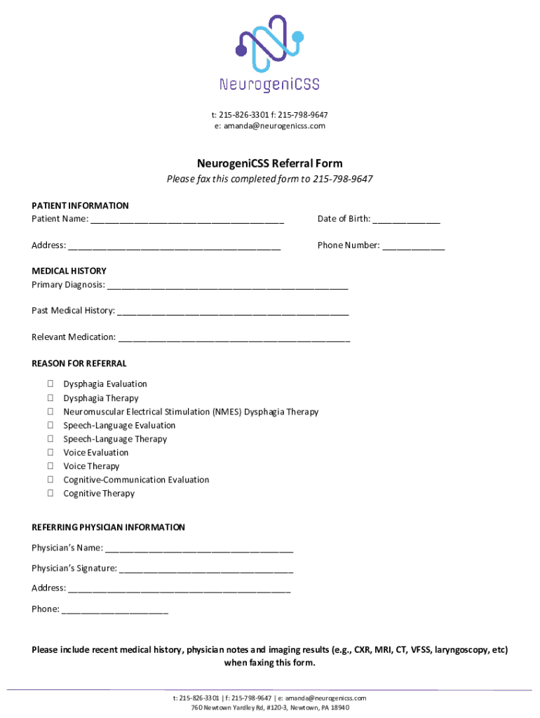 e: amanda@neurogenicss.comNeurogeniCSS Referral FormPlease fax this completed form to 2157989647