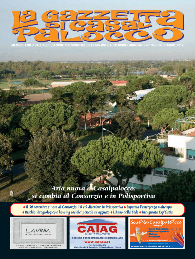 MENSILE EDITO DALLASSOCIAZIONE POLISPORTIVA DILETTANTISTICA PALOCCO ANNO 45 N 386 NOVEMBRE 2012Aria nuova a Casalpalocco: si al Consorzio e in Polisportiva Il30 novembre si vota al Consorzio, l8 e