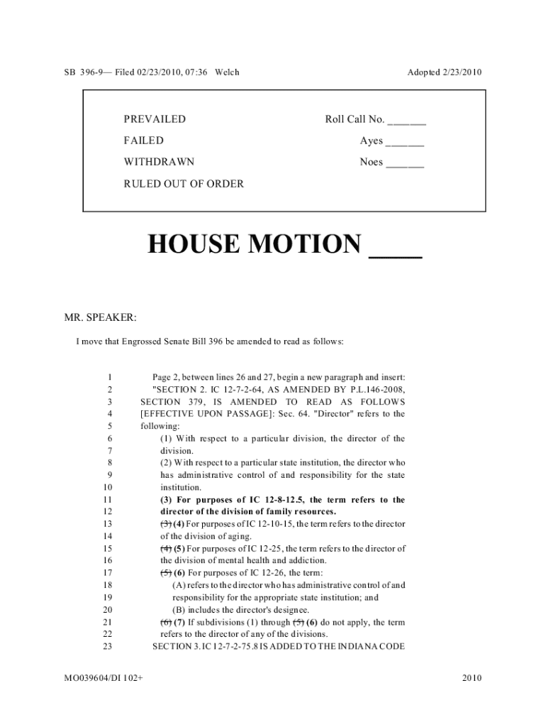 SB 3969 Filed 02/23/2010, 07:36 WelchPREVAILEDAdopted 2/23/2010Roll Call No. ___FAILEDAyes ___WITHDRAWNNoes ___RULED OUT OF ORDERHOUSE MOTION ___ MR. SPEAKER: I move that Engrossed Senate Bill 396