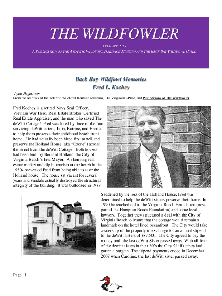 THE WILDFOWLER FEBRUARY 2019A PUBLICATION OF THE ATLANTIC WILDFOWL HERITAGE MUSEUM AND THE BACK BAY WILDFOWL GUILDBack Bay Wildfowl Memories Fred L. Kochey Lynn Hightower From the archives of the