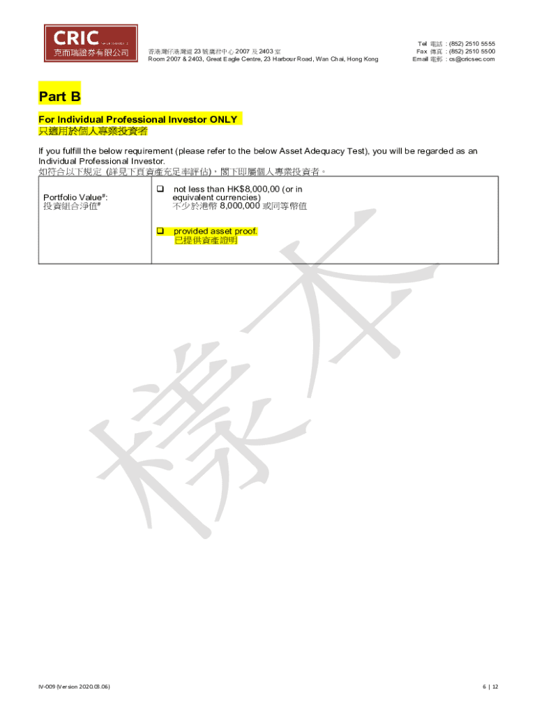 23 2007 2403 Room 2007 & 2403, Great Eagle Centre, 23 Harbour Road, Wan Chai, Hong KongTel : (852) 2510 5555 Fax : (852) 2510 5500 Email : cs@cricsec.comPart B For Individual Professional Investor