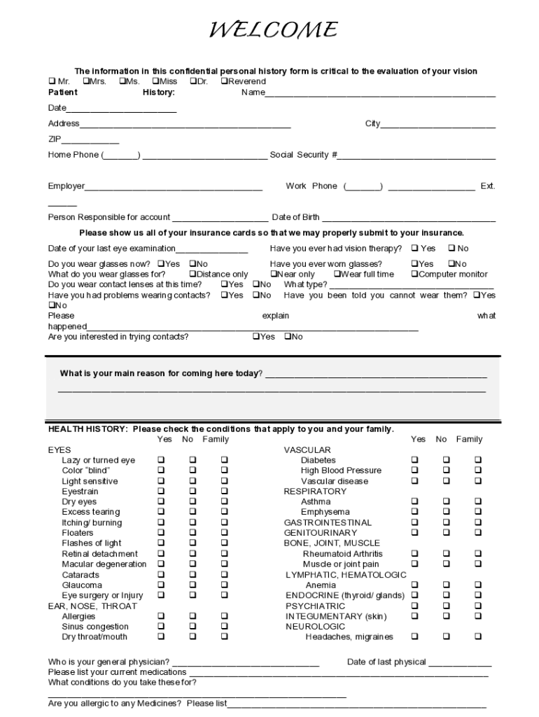 WELCOME The information in this confidential personal history form is critical to the evaluation of your vision q Mr. qMrs. qMs. qMiss qDr. qReverend Patient History: Name___ Date___ Address___City___ZIP___