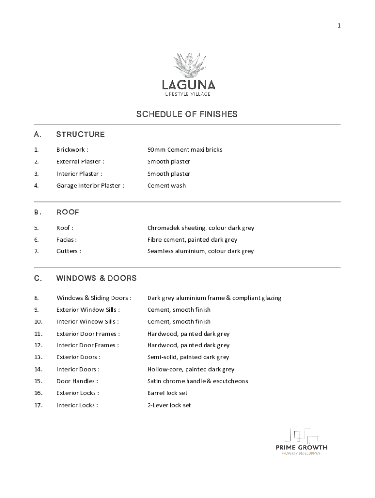 1SCHEDULE OF FINISHES A.STRUCTURE1.Brickwork :90mm Cement maxi bricks2.External Plaster :Smooth plaster3.Interior Plaster :Smooth plaster4.Garage Interior Plaster :Cement washB.ROOF5.Roof :Chromadek