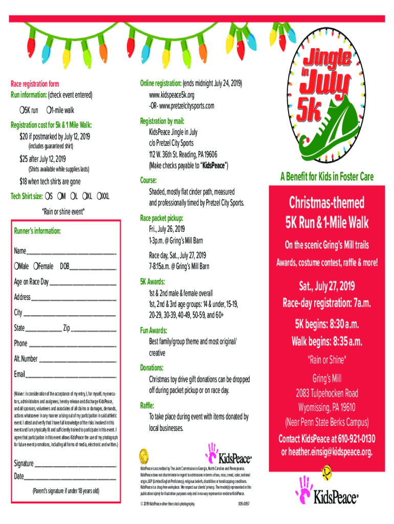 m5K runm1mile walkRegistration cost for 5k & 1-Mile Walk:$20 if postmarked by July 12, 2019(includes guaranteed shirt)