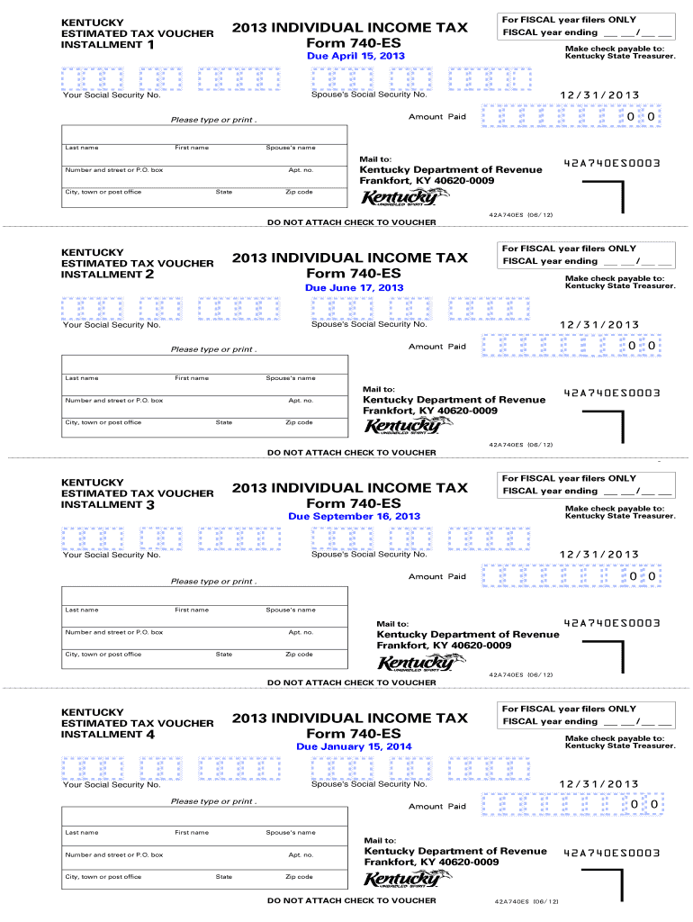 KENTUCKY ESTIMATED TAX VOUCHER INSTALLMENT 1 2013 INDIVIDUAL INCOME TAX Form 740-ES For FISCAL year filers ONLY FISCAL year ending / ARAB AAB AAAA ARAB AAB AAAA CCC CCD CC CCD CCC CCD CC CCD 12/31/2013