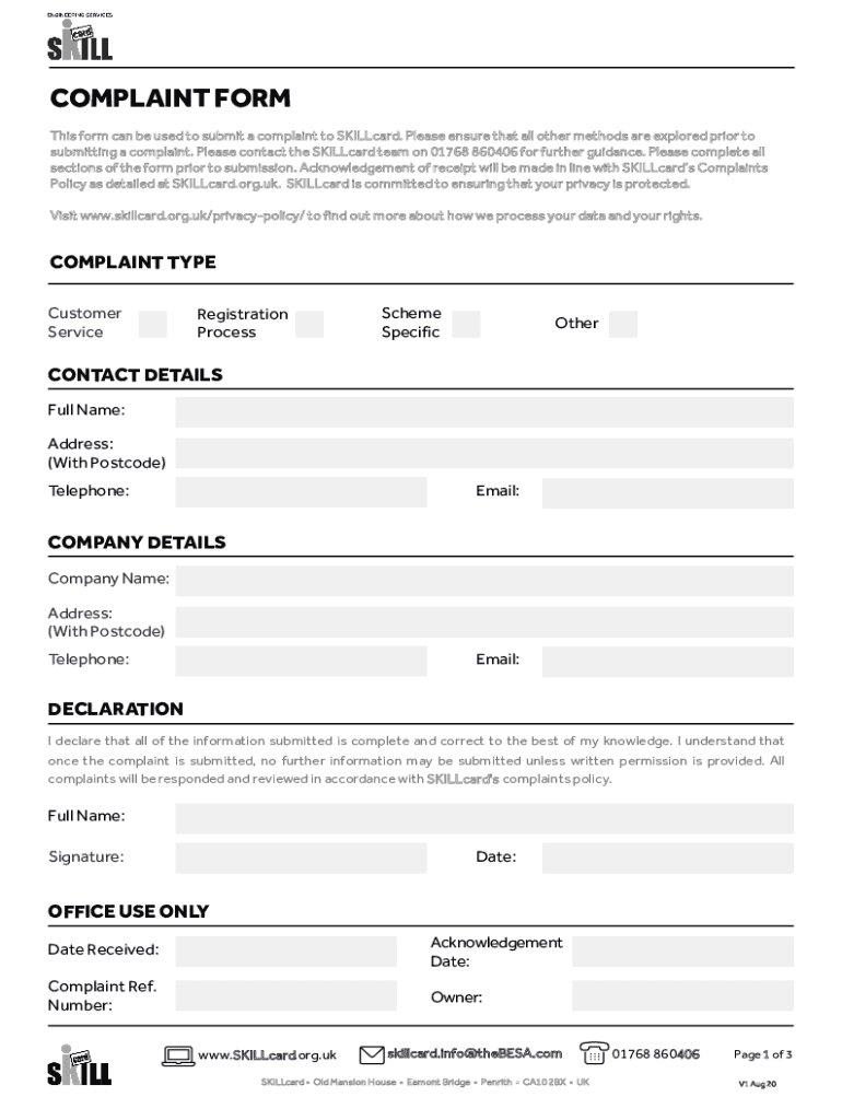 This form can be used to submit a complaint to SKILL card. Please ensure that all other methods are explored prior to