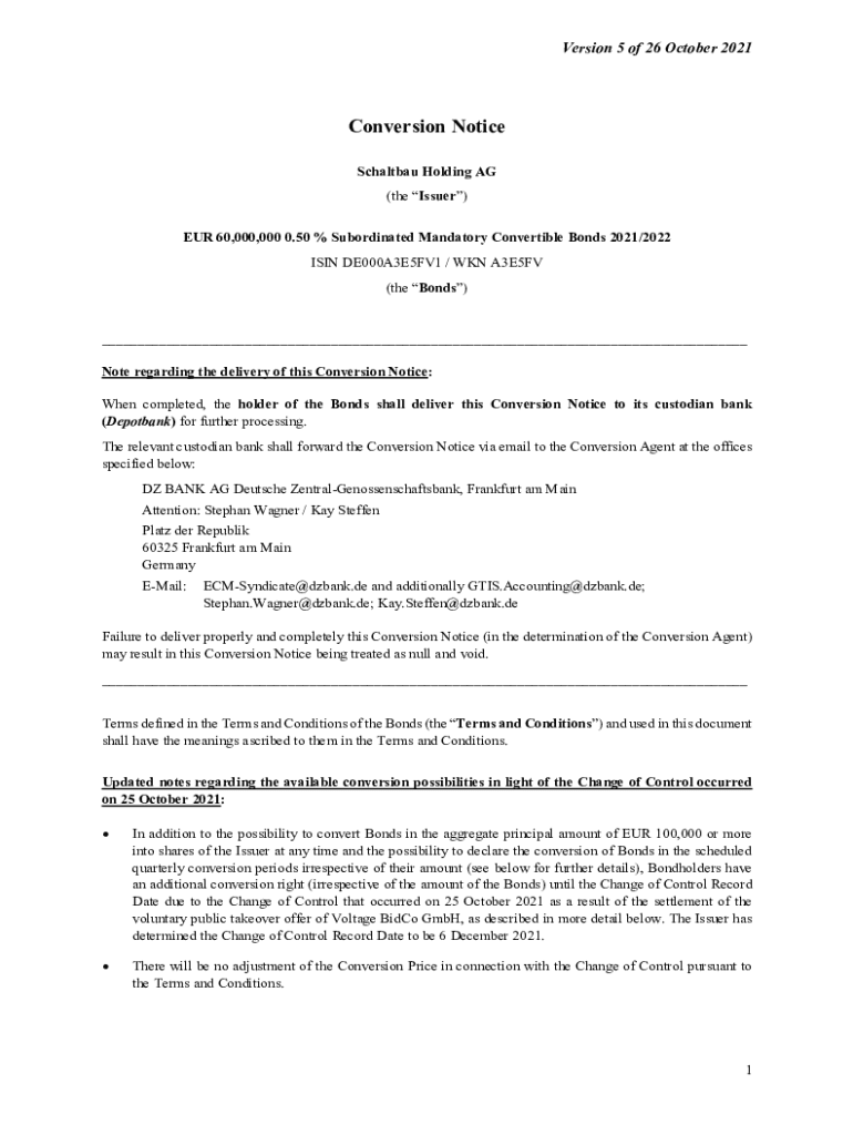 Version 5 of 26 October 2021Conversion Notice Schaltbau Holding AG (the Issuer) EUR 60,000,000 0.50 % Subordinated Mandatory Convertible Bonds 2021/2022 ISIN DE000A3E5FV1 / WKN A3E5FV (the Bonds)___