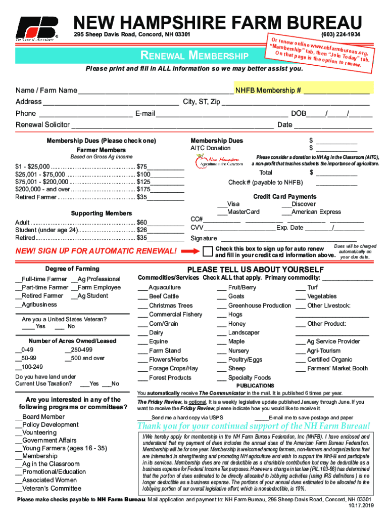 NEW HAMPSHIRE FARM BUREAU 295 Sheep Davis Road, Concord, NH 03301(603) 2241934Renewal MembershipOr renew online w Membe ww.nhfa rship ta rmburea b, then u On that Join Tod .org, page is ay tab. the