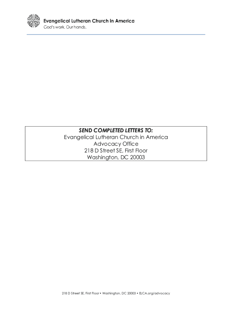 SEND COMPLETED LETTERS TO: Evangelical Lutheran Church in America Advocacy Office 218 D Street SE, First Floor Washington, DC 20003218 D Street SE, First Floor Washington, DC 20003 ELCA.org/advocacy(date)(Member