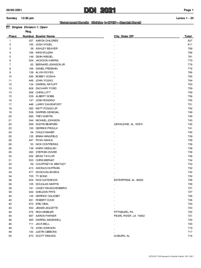 DDI DDI 2021 202106/06/2021 Sunday12:30 pmPage 1 Lanes 1 24Tournament Tournament Results Results Division Division 1: 1: OPEN OPEN Scratch Scratch Result Result z Singles Division 1: Open Reg. Place