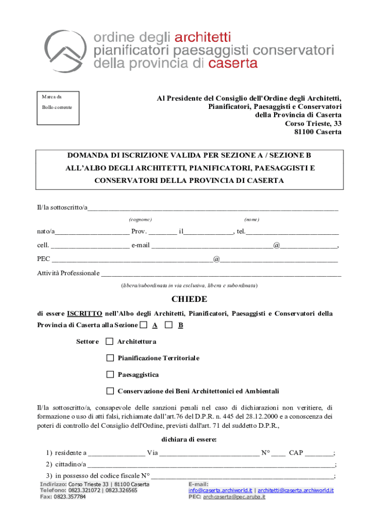 Al Presidente del Consiglio dell\'Ordine degli Architetti, Pianificatori, Paesaggisti e Conservatori della Provincia di Caserta Corso Trieste, 33 81100 CasertaMarca da Bollo correnteDOMANDA DI ISCRIZIONE
