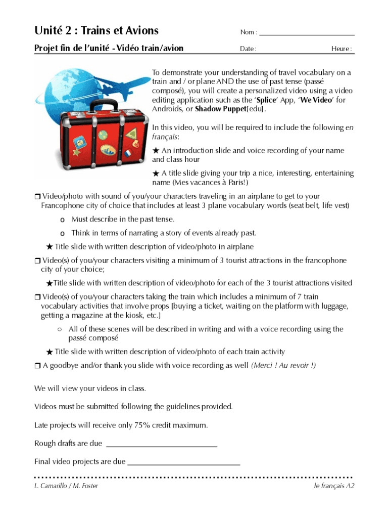 Unit 2 : Trains et AvionsNom :Projet fin de lunit Vido train/avionDate :Heure :To demonstrate your understanding of travel vocabulary on a train and / or plane AND the use of past tense (pass compos),