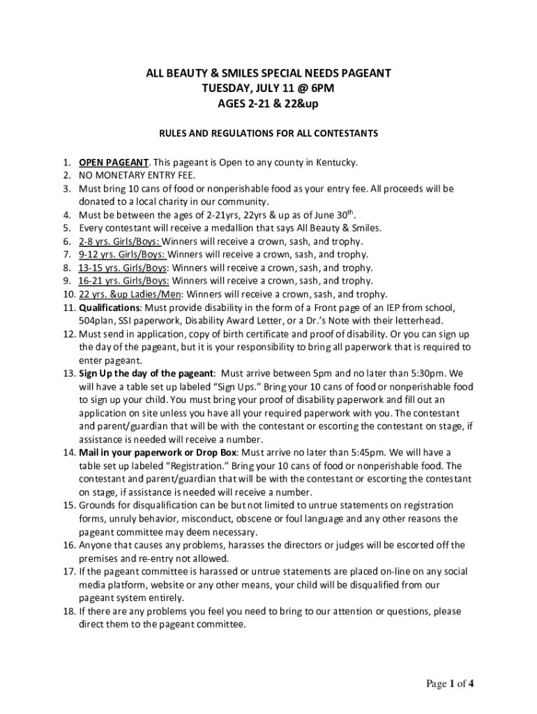 ALL BEAUTY & SMILES SPECIAL NEEDS PAGEANT TUESDAY, JULY 11 @ 6PM AGES 221 & 22&up RULES AND REGULATIONS FOR ALL CONTESTANTS 1. OPEN PAGEANT. This pageant is Open to any county in Kentucky. 2. NO MONETARY