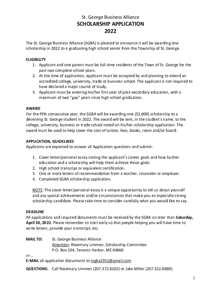 St. George Business AllianceSCHOLARSHIP APPLICATION 2022 The St. George Business Alliance (SGBA) is pleased to announce it will be awarding one scholarship in 2022 to a graduating high school senior