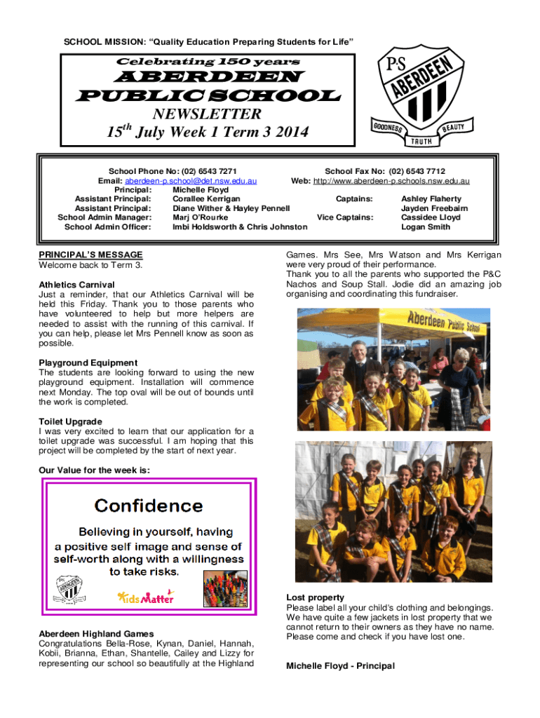 SCHOOL MISSION: Quality Education Preparing Students for LifeCelebrating 150 yearsABERDEEN PUBLIC SCHOOL NEWSLETTER 15th July Week 1 Term 3 2014 School Phone No: (02) 6543 7271 School Fax No: (02)