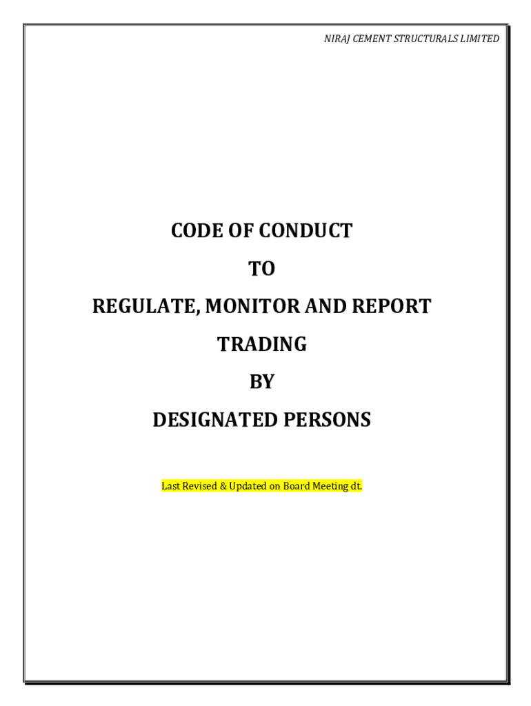 NIRAJ CEMENT STRUCTURALS LIMITEDCODE OF CONDUCT TO REGULATE, MONITOR AND REPORT TRADING BY DESIGNATED PERSONS Last Revised & Updated on Board Meeting dt.NIRAJ CEMENT STRUCTURALS LIMITED1. PREFACE