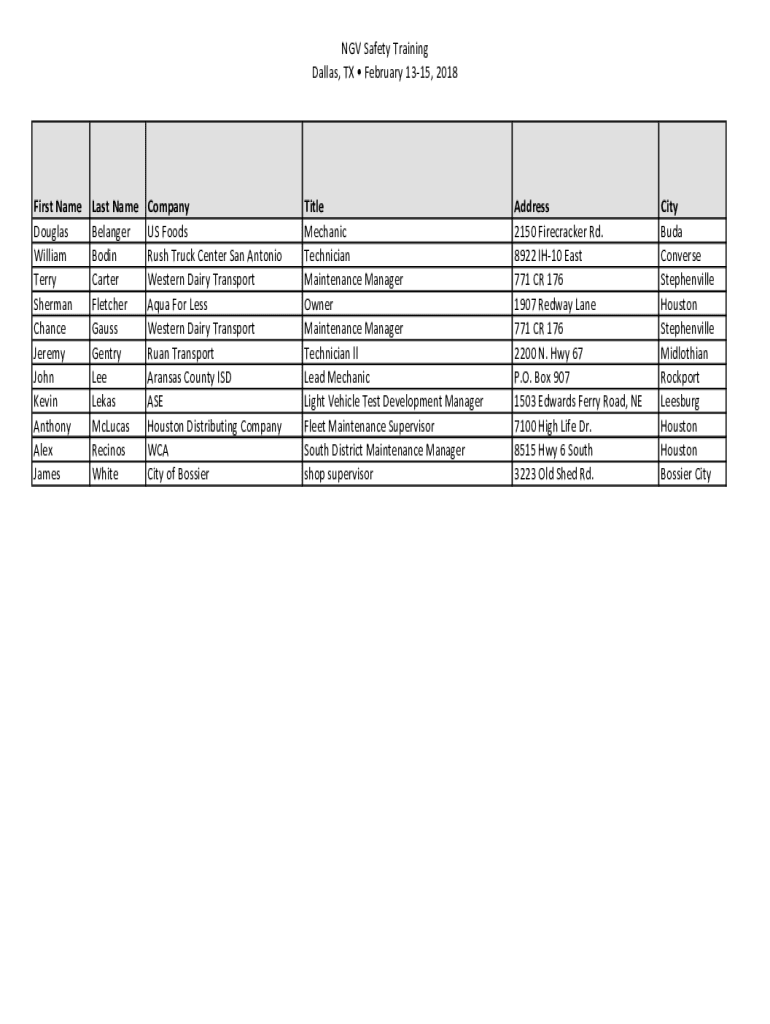 NGV Safety Training Dallas, TX February 1315, 2018First Name Douglas William Terry Sherman Chance Jeremy John Kevin Anthony Alex JamesLast Name Belanger Bodin Carter Fletcher Gauss Gentry Lee Lekas
