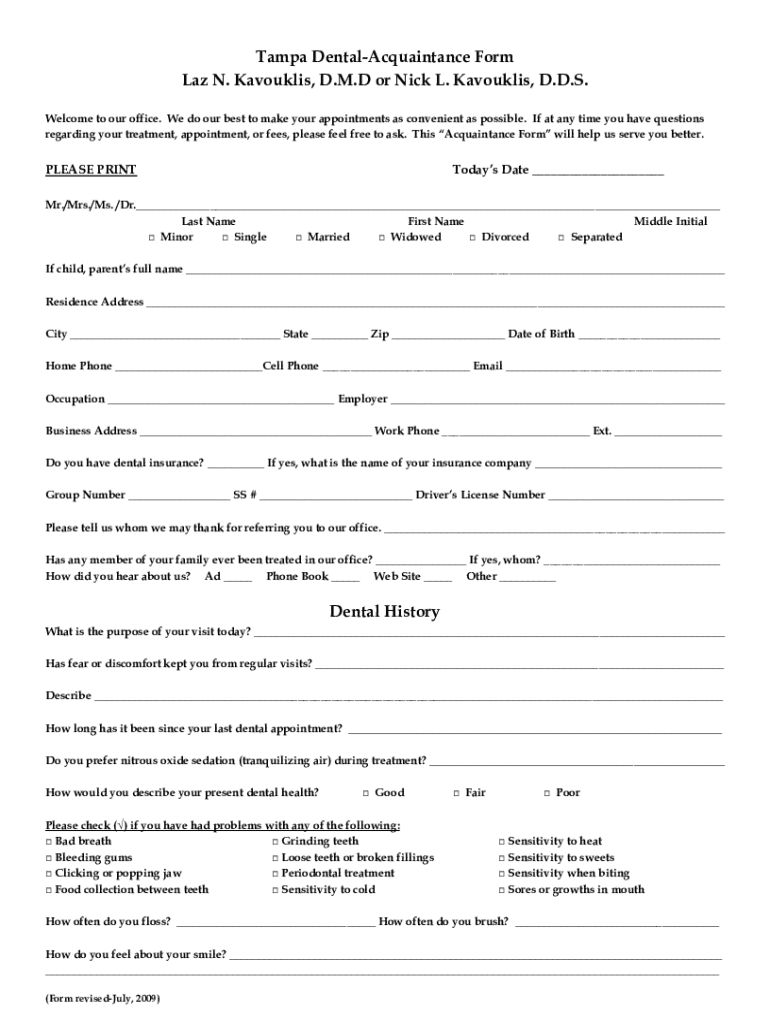 Get the free Tampa Dental-Acquaintance Form Laz N. Kavouklis, D.M.D ...