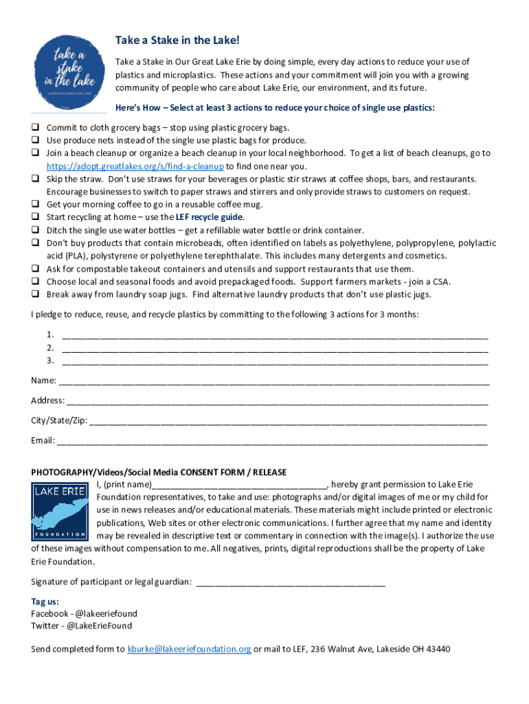 Take a Stake in the Lake! Take a Stake in Our Great Lake Erie by doing simple, every day actions to reduce your use of plastics and microplastics. These actions and your commitment will join you with