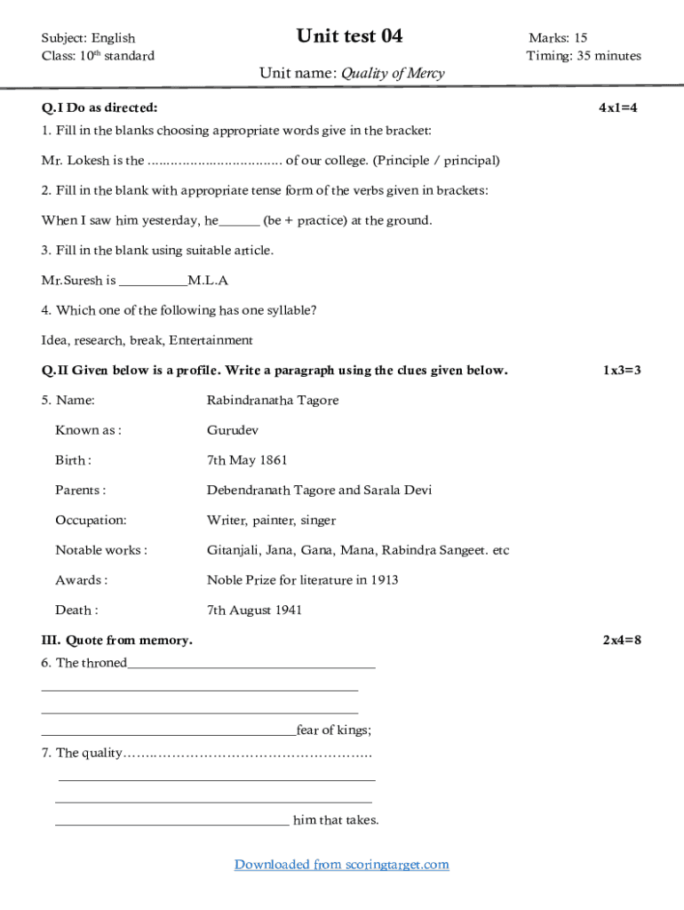 Get the free Quality of Mercy unit test question paper with key answer.docx
