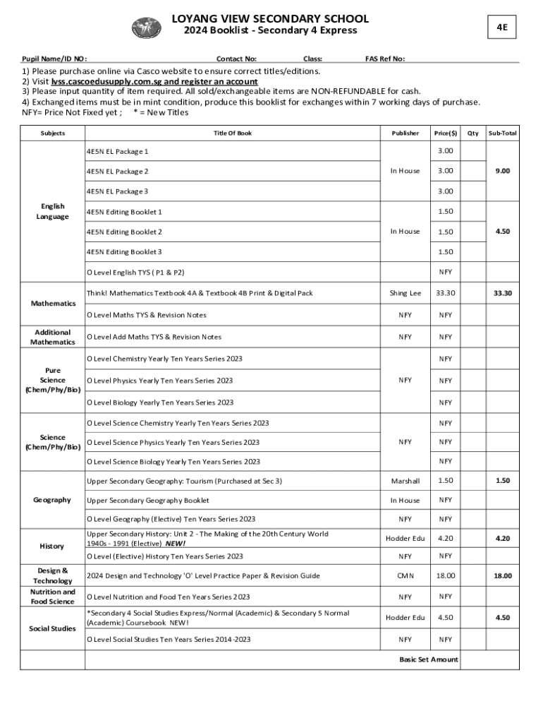 LOYANG VIEW SECONDARY SCHOOL4E2024 Booklist Secondary 4 ExpressPupil Name/ID NO:Contact No:Class:FAS Ref No:1) Please purchase online via Casco website to ensure correct titles/editions. 2) Visit