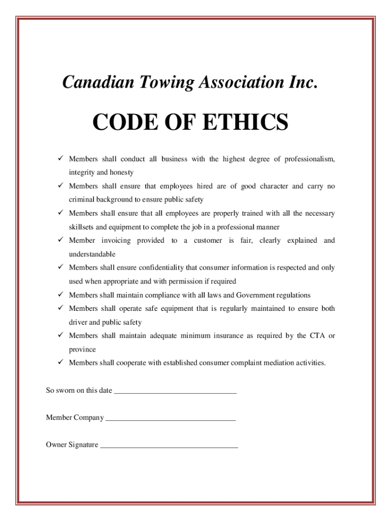 Canadian Towing Association Inc.CODE OF ETHICS Members shall conduct all business with the highest degree of professionalism, integrity and honesty Members shall ensure that employees hired are of