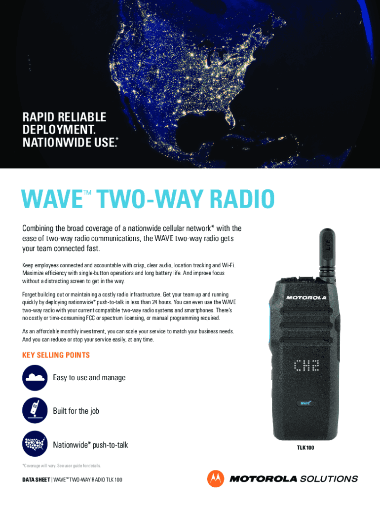 RAPID RELIABLE DEPLOYMENT. NATIONWIDE USE.*WAVE TWOWAY RADIO Combining the broad coverage of a nationwide cellular network* with the ease of twoway radio communications, the WAVE twoway radio gets