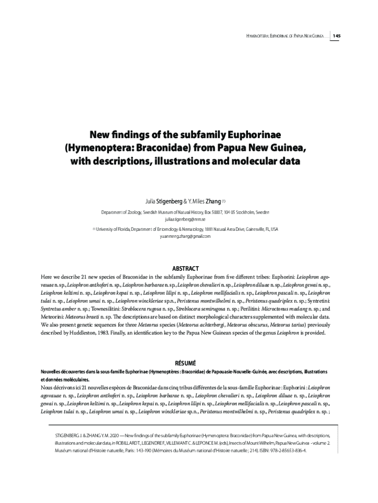 HYMENOPTERA: EUPHORINAE OF PAPUA NEW GUINEANew findings of the subfamily Euphorinae (Hymenoptera: Braconidae) from Papua New Guinea, with descriptions, illustrations and molecular dataJulia Stigenberg
