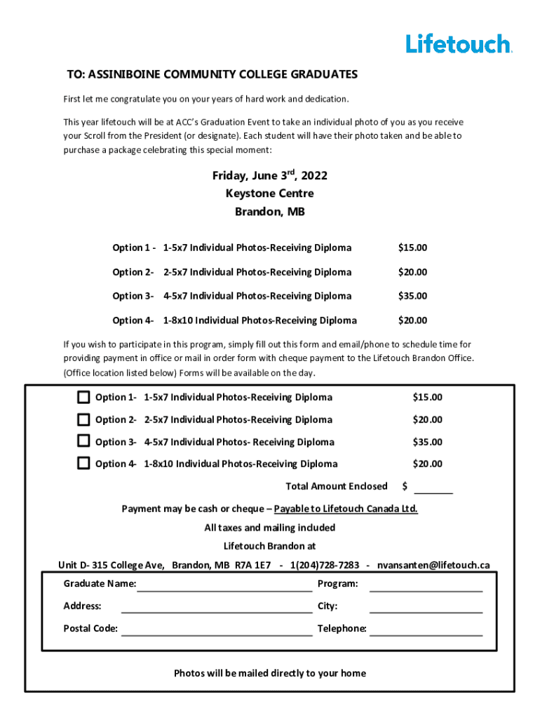 TO: ASSINIBOINE COMMUNITY COLLEGE GRADUATES First let me congratulate you on your years of hard work and dedication. This year lifetouch will be at ACCs Graduation Event to take an individual photo