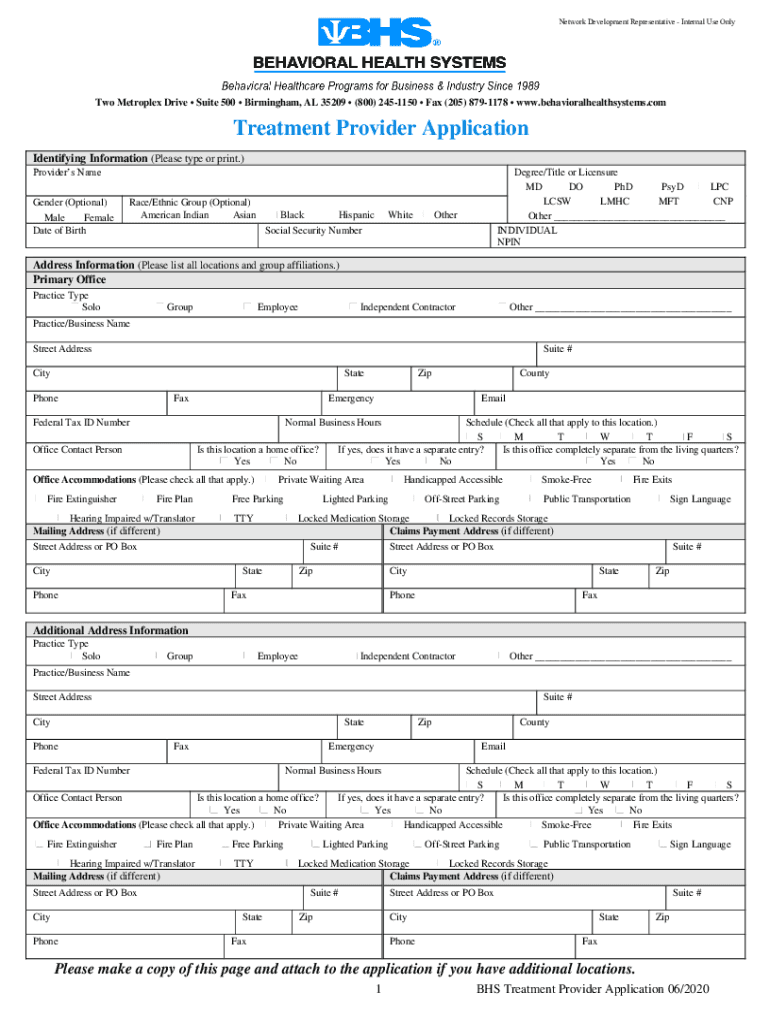 Network Development Representative Internal Use OnlyTwo Metroplex Drive Suite 500 Birmingham, AL 35209 (800) 2451150 Fax (205) 8791178 www.behavioralhealthsystems.comTreatment Provider Application