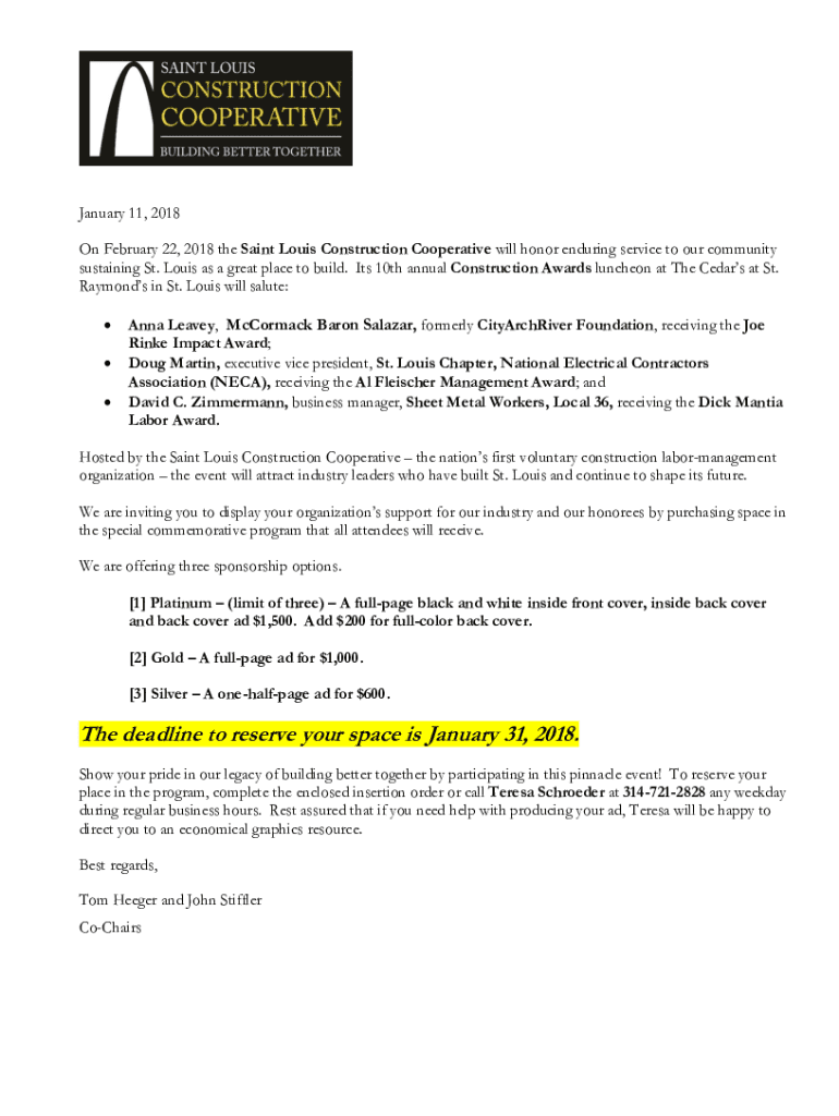 January 11, 2018 On February 22, 2018 the Saint Louis Construction Cooperative will honor enduring service to our community sustaining St. Louis as a great place to build. Its 10th annual Construction