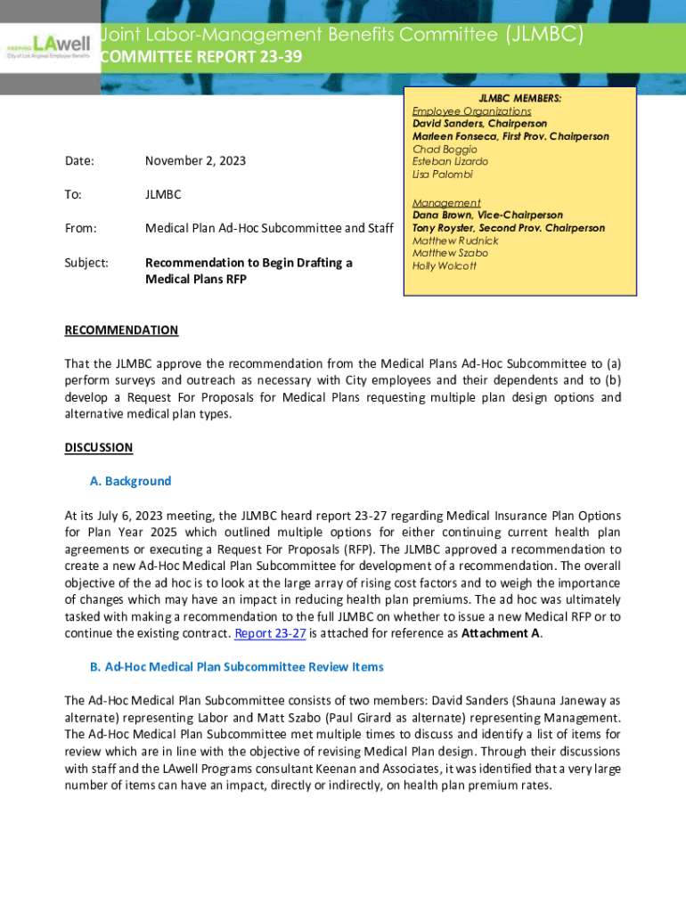 Joint LaborManagement Benefits Committee (JLMBC) COMMITTEE REPORT 2339Date:November 2, 2023To:JLMBCFrom:Medical Plan AdHoc Subcommittee and StaffSubject:Recommendation to Begin Drafting a Medical