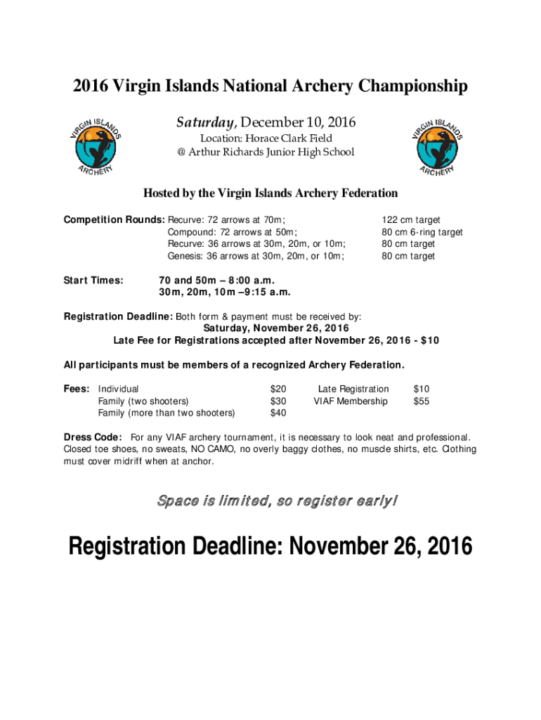 2016 Virgin Islands National Archery Championship Saturday, December 10, 2016 Location: Horace Clark Field @ Arthur Richards Junior High SchoolHosted by the Virgin Islands Archery Federation Competition