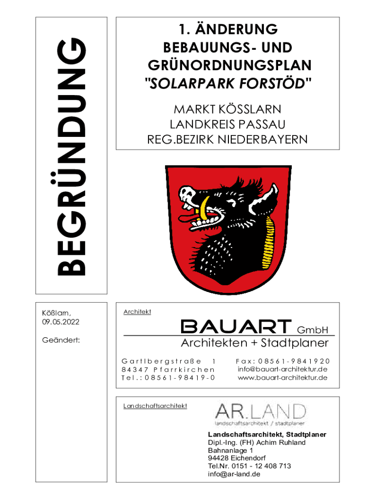BEGRNDUNG Klarn, 09.05.2022 Gendert:1. NDERUNG BEBAUUNGS UND GRNORDNUNGSPLAN \"SOLARPARK FORSTD\" MARKT KSSLARN LANDKREIS PASSAU REG.BEZIRK NIEDERBAYERNArchitektbauart GmbH Architekten + StadtplanerGartlbergstrae