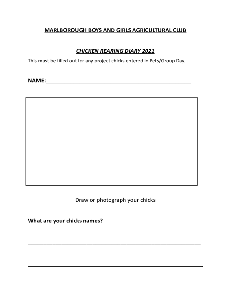 MARLBOROUGH BOYS AND GIRLS AGRICULTURAL CLUBCHICKEN REARING DIARY 2021 This must be filled out for any project chicks entered in Pets/Group Day.NAME:___Draw or photograph your chicksWhat are your