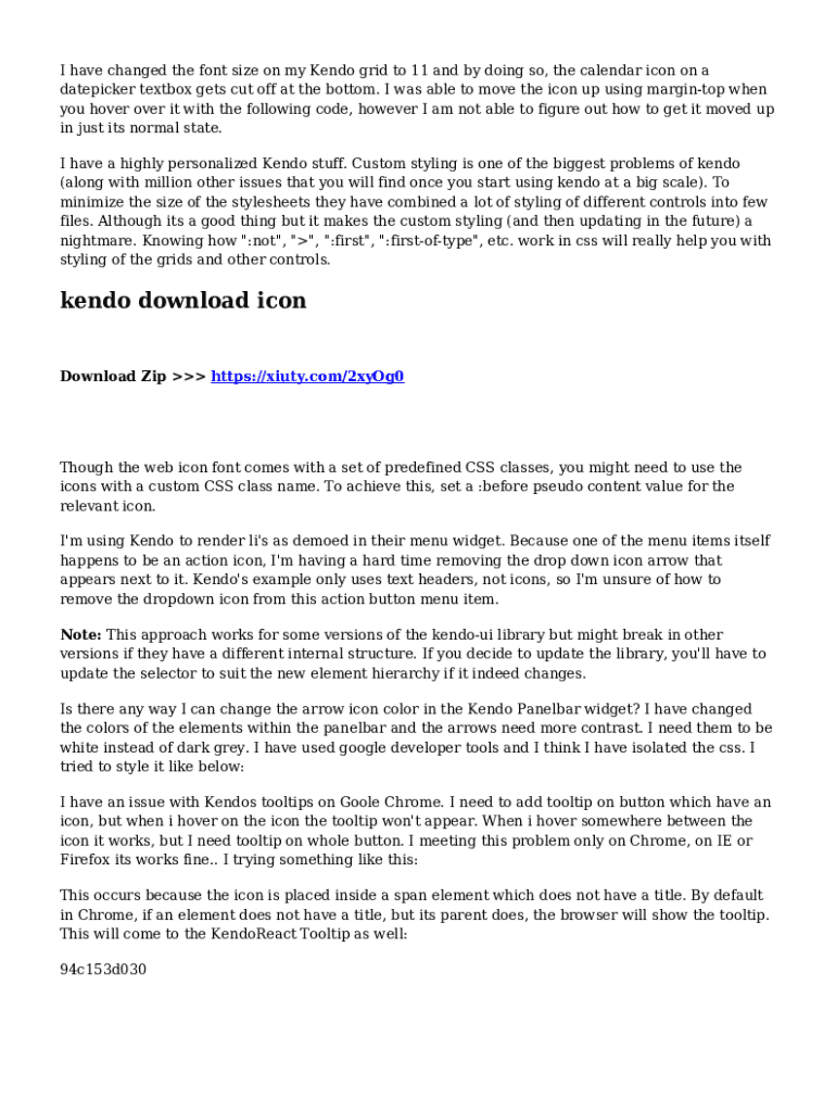 I have changed the font size on my Kendo grid to 11 and by doing so, the calendar icon on a datepicker textbox gets cut off at the bottom. I was able to move the icon up using margintop when you hover