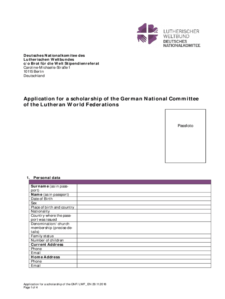 Deutsches Nationalkomitee des Lutherischen Weltbundes c/o Brot fr die Welt Stipendienreferat CarolineMichaelisStrae 1 10115 Berlin DeutschlandApplication for a scholarship of the German National Committee
