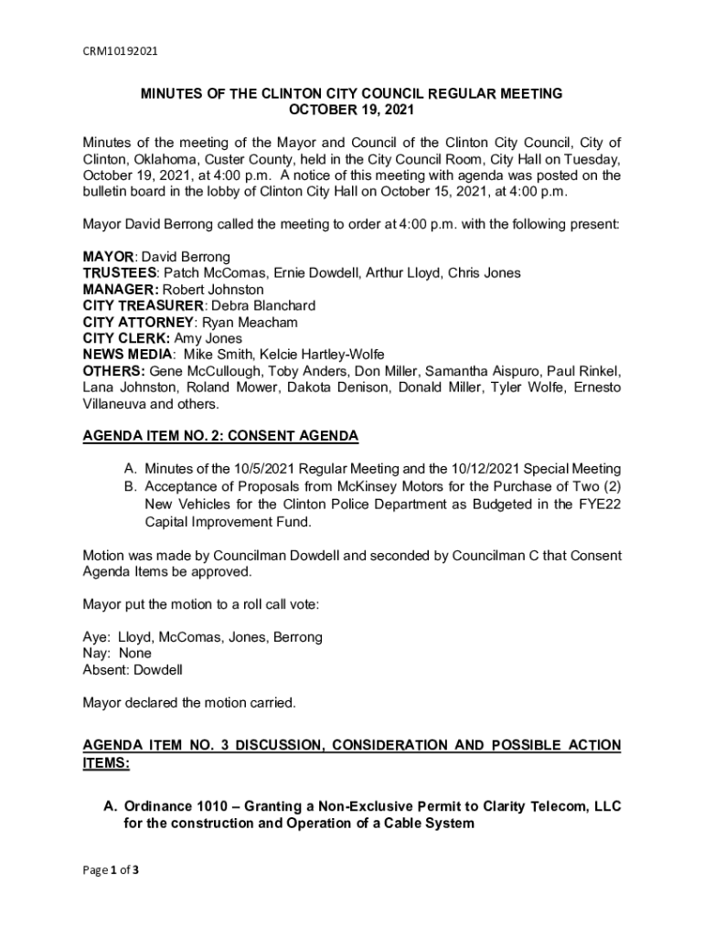 CRM10192021MINUTES OF THE CLINTON CITY COUNCIL REGULAR MEETING OCTOBER 19, 2021 Minutes of the meeting of the Mayor and Council of the Clinton City Council, City of Clinton, Oklahoma, Custer County,