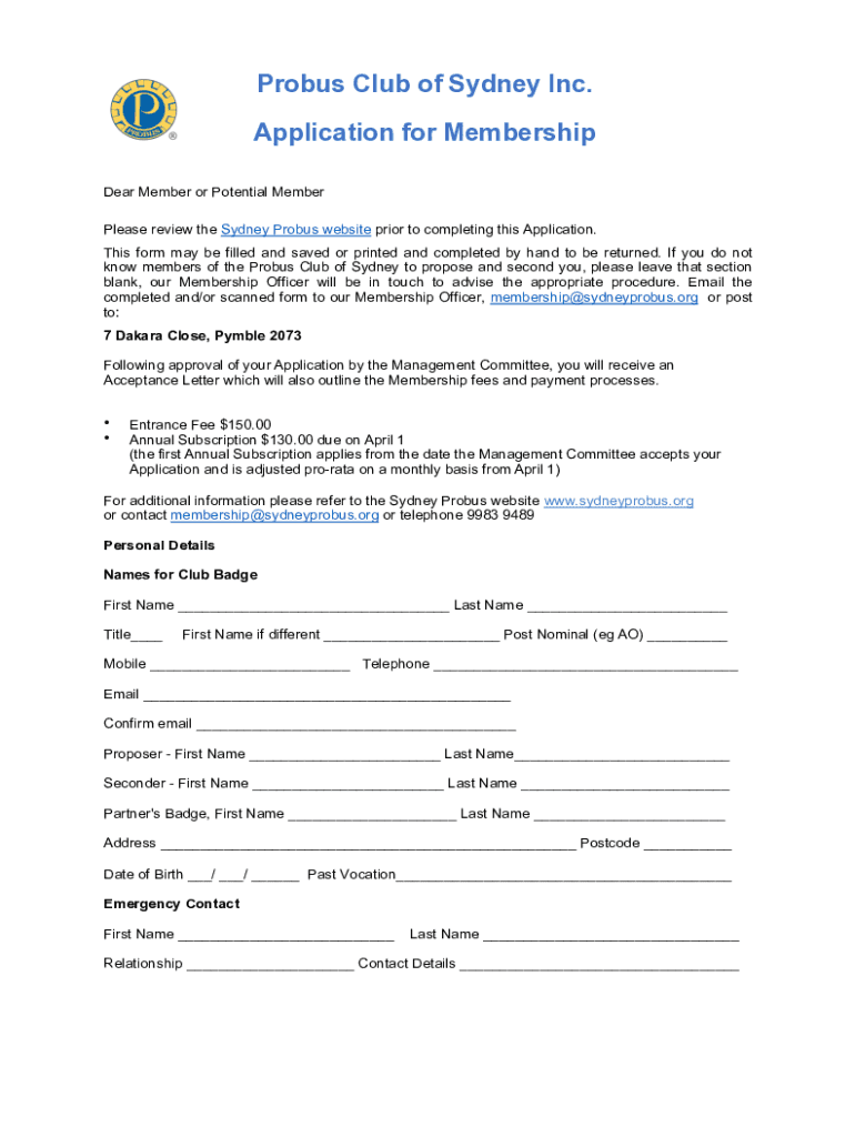 Probus Club of Sydney Inc. Application for Membership Dear Member or Potential Member Please review the Sydney Probus website prior to completing this Application. This form may be filled and saved